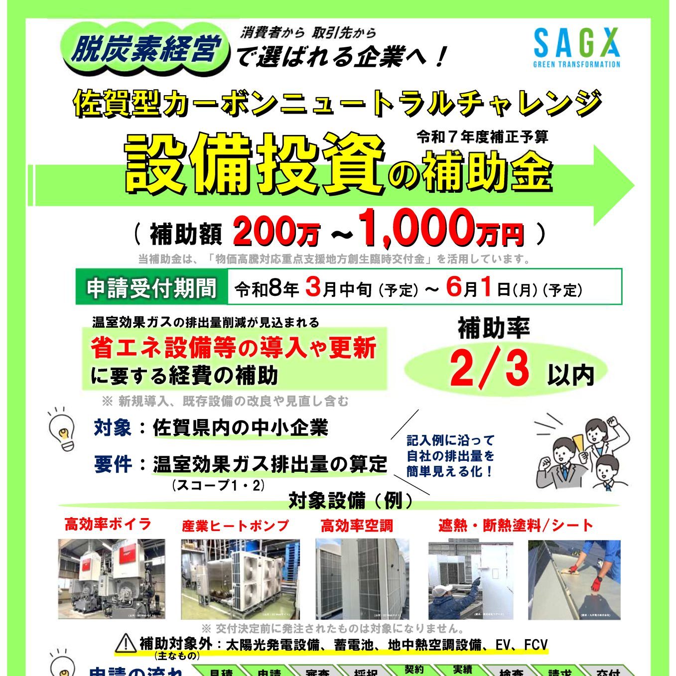 【公募予告】(令和7年度補正予算)佐賀型カーボンニュートラルチャレンジ設備投資促進事業費補助金について